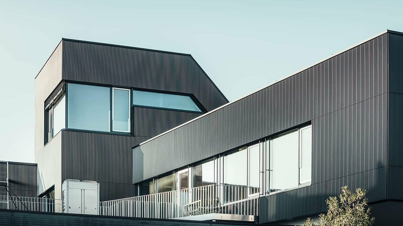 Bei der Materialsuche stießen der Bauherr und der Architekt fast gleichzeitig und unabhängig voneinander bei einem Gebäude in der benachbarten Schweiz auf die gezackte Fassadenbekleidung aus Aluminium. Ursprünglich wollte Bereiter sogar das geneigte Dach damit bekleiden und das Wasser ohne Rinne über die Fassade ableiten, um die Homogenität des Zubaus zu verstärken. Dies war jedoch aus mehreren Gründen nicht möglich, weshalb gleichfarbiges Prefalz zum Einsatz kam.