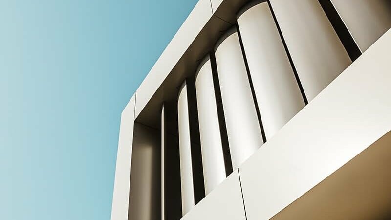 Straßenseitig ragt die Aluminiumfassade ein Stück weit über die darunterliegende Steinfassade und bietet damit einen Regenschutz entlang des Gebäudes auf dem gepflasterten Vorplatz. Zwischen Haus und Garagen erzielte man einen homogenen Übergang mit der PREFABOND Aluminium Verbundplatte. Auf der rechten Seite des Gebäudes setzt sich auf Erdgeschossniveau die Front aus Steinplatten als Umfriedung des Gartenbereichs fort. Eine Öffnung und Auflockerung der Fassade erzeugen Lamellen, die man im Quader in regelmäßigen Gruppierungen wie Wellen anordnete. Das Ergebnis ist organisch und transparent: Zwischen den Lamellen fällt Licht in das Gebäude ein, zugleich bieten sie einen Sichtschutz zur Straße hin.