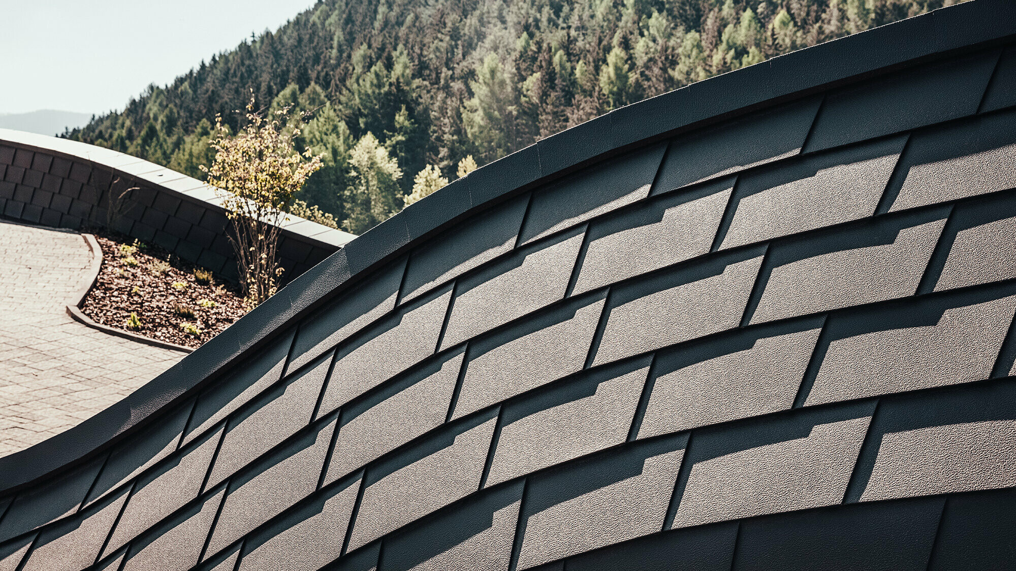 „Was ich am schönsten finde, ist das Spazieren über die Dachwelle. Das ist ein Mehrwert, den es vorher nicht gab“, schwärmt Andreas Profanter von dem organischen Element, das trotz massiver Bauweise in seiner dynamischen Ausführung Leichtigkeit und Beweglichkeit ausstrahlt. Eben wie Wasser. Damit reflektiert das Gebäude auch den See, der direkt an das Hotel anschließt. In der Tat ist die mit PREFA Wandschindeln in P.10 Braun umhüllte Brüstung (es handelt sich hier um eine objektbezogene Sonderlösung) ein Hingucker und genauso eine technisch präzise Meisterleistung! Wie eine Amphibie legt sich der Schutzwall um den gesamten Erlebnis-Komplex. Die Architekten suchten einen möglichst kleinteilig einsetzbaren Baustoff, mit dem man den minimalen Radius schaffen könne: Der Architekt spricht in diesem Kontext von einer „kleineren Auflösung“, die man damit erzeuge. Um herauszufinden, ob es wie gewünscht funktionieren könne, baute man zunächst auf einer Länge von 4 bis 5 Metern die Dachbrüstung nach. Mit optimalem Ergebnis: „Gute Spengler, wie die der Firma Kammerer aus Ehrenburg, sind für ein solches Vorhaben die Voraussetzung“, sagt Andreas Profanter, dem auch die regionale Wertschöpfung am Herzen liegt. Die gesamte Brüstung inklusive Untersicht wurde in haargenauer Ausführung von den Profis mit PREFA Wandschindeln umhüllt. Das Material brachte die Vertriebsfirma Alpewa ins Spiel. Die Zusammenarbeit mit der Firma unter der Projektleitung von Lorenz Pichler habe sehr gut funktioniert, sagt Andreas Profanter rückblickend.