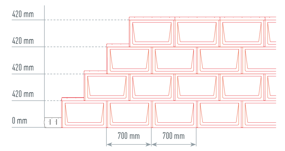 Vertikale Schnürung: 700 mm (jede zweite Reihe um 350 mm versetzt)