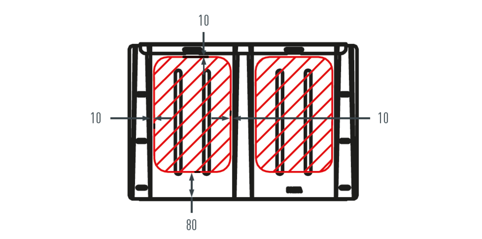 Achten Sie bei der Montage von Dachzubehörprodukten auf den zulässigen Montagebereich auf den Dachplatten. Nachfolgende Abbildung zeigt den Montagebereich für Zubehörprodukte auf Fußteilen. Für andere Zubehörprodukte können abweichende Montagebereiche definiert sein.