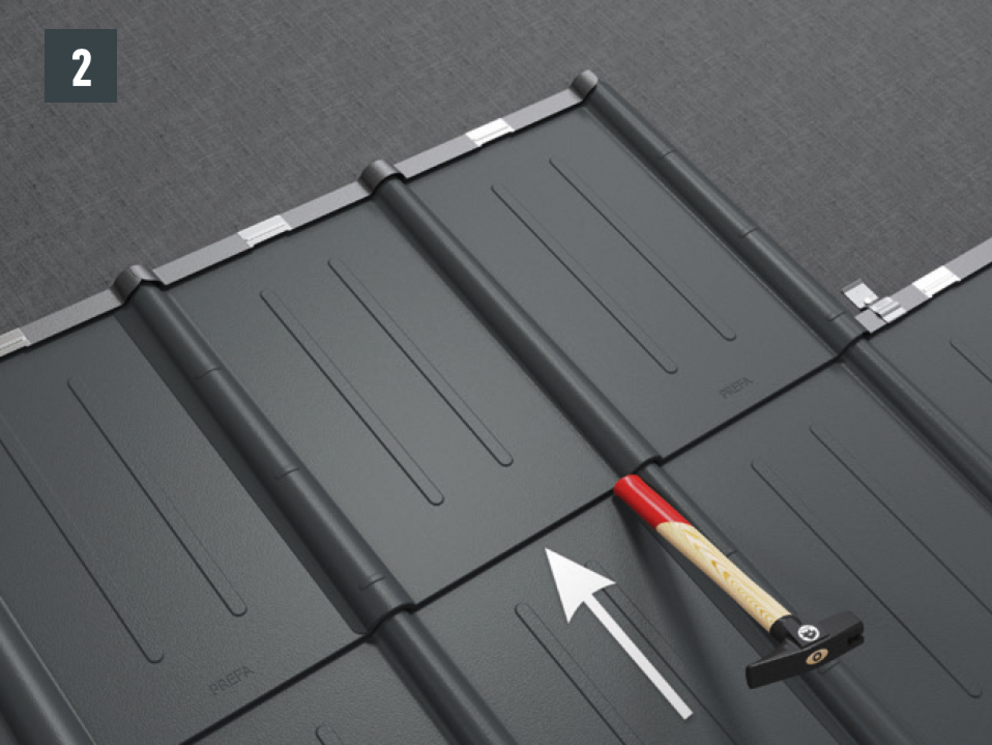 Drücken Sie die Platte in den Hakenfalz. Stoßen Sie an der Plattenunterkante leicht mit dem Hammerstiel nach (Bild 2).