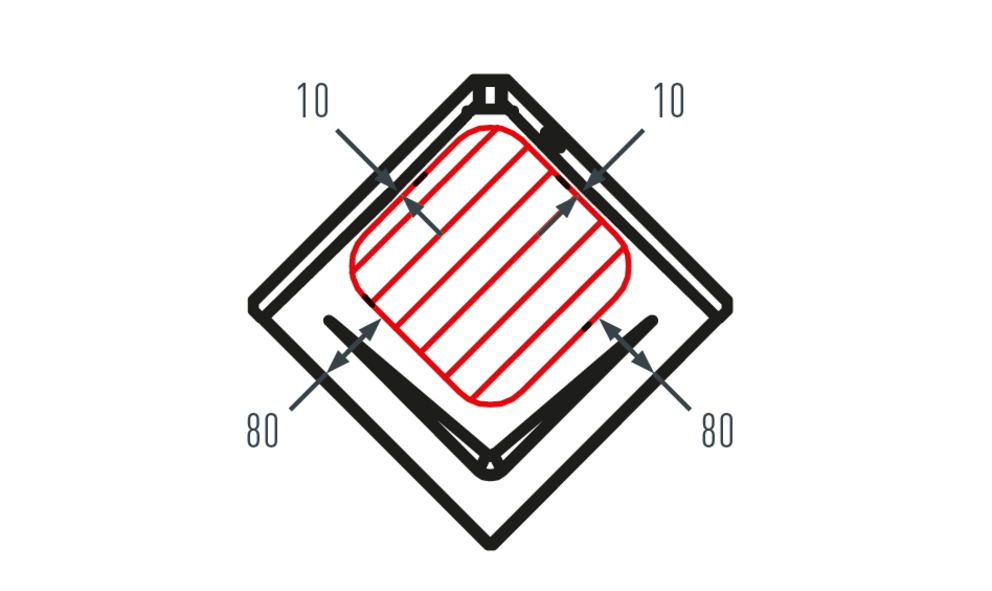 Achten Sie bei der Montage von Dachzubehörprodukten auf den zulässigen Montagebereich auf den Dachrauten 29 × 29. Nachfolgende Abbildung zeigt den Montagebereich für Zubehörprodukte auf Fußteilen. Für andere Zubehörprodukte können abweichende Montagebereiche definiert sein.