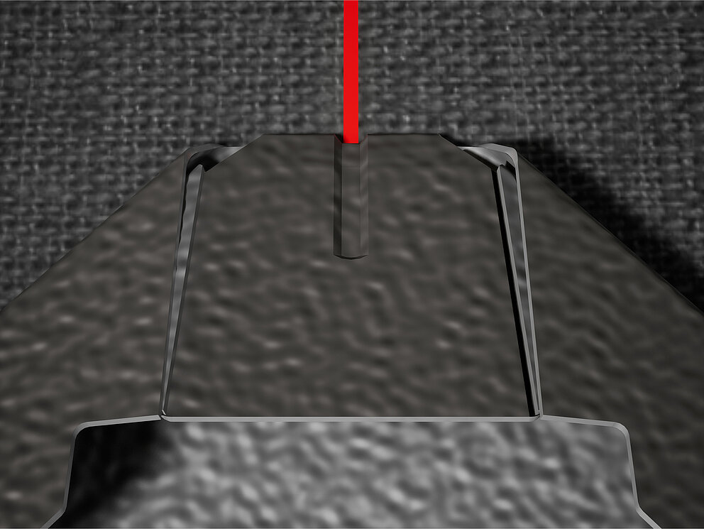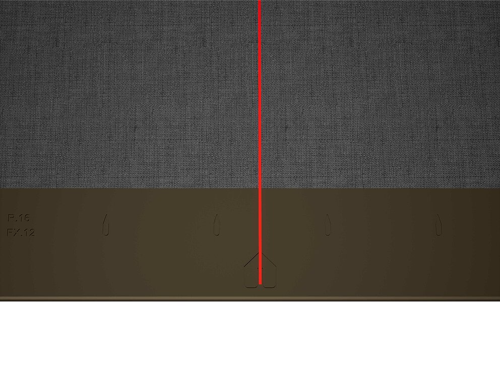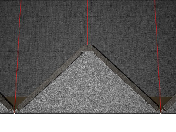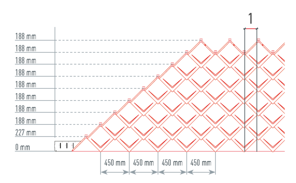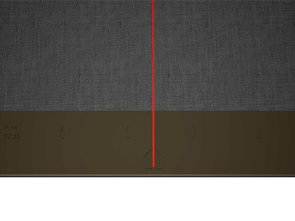 Zur Hilfestellung bei der Verlegung der PREFA Dachrauten 29 × 29 empfiehlt es sich, einen Raster aus senkrechten Schnurschlägen im Abstand von 450 mm herzustellen (als Hilfestellung dienen die Markierungen im Saumstreifen). Um das Schnürmaß in jeder Reihe genau einzuhalten, kann bei Bedarf auch das halbe Schnürmaß angezeichnet und in regelmäßigen Abständen geprüft werden. Richten Sie die Startplatten mit den Kerben (an der Oberkante der Startplatten) an den senkrechten Schnurschlägen aus (siehe Abbildung unten). Hierbei ist zu beachten, dass der Bereich für die seitliche Aufkantung (z. B. Ortgangausbildung) nicht mittig in den Dachrauten 29 × 29 liegt (Symmetrie/Dachmitte beachten).