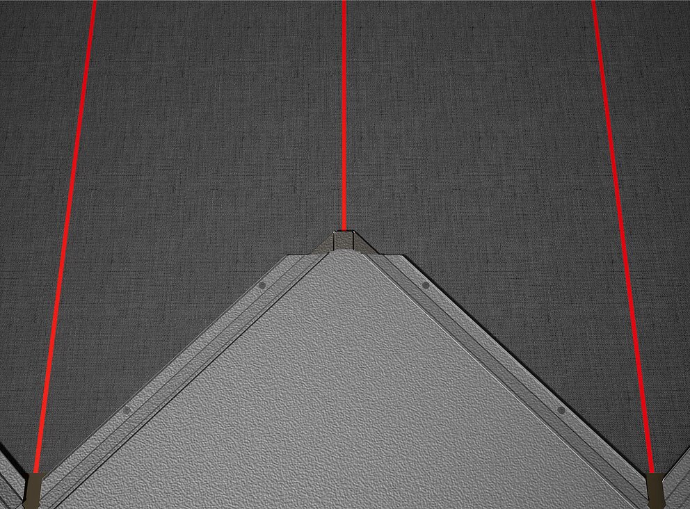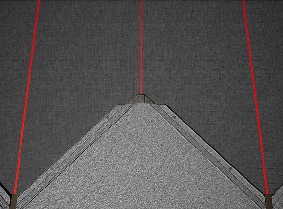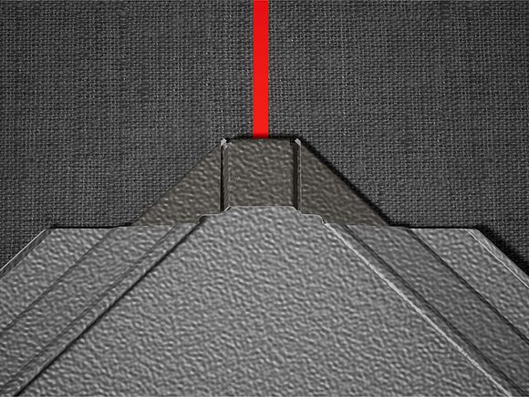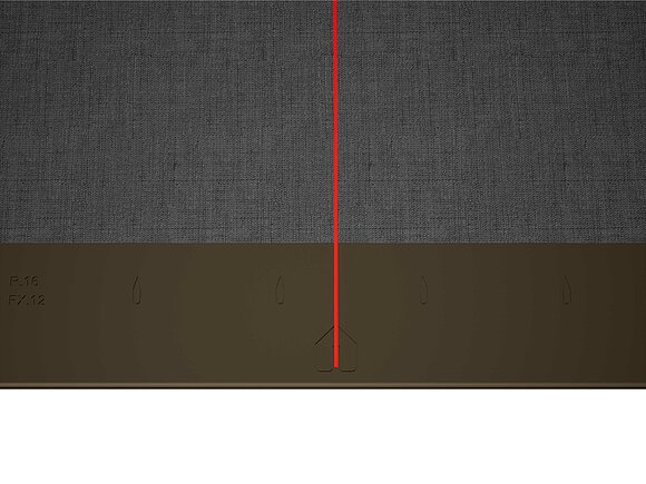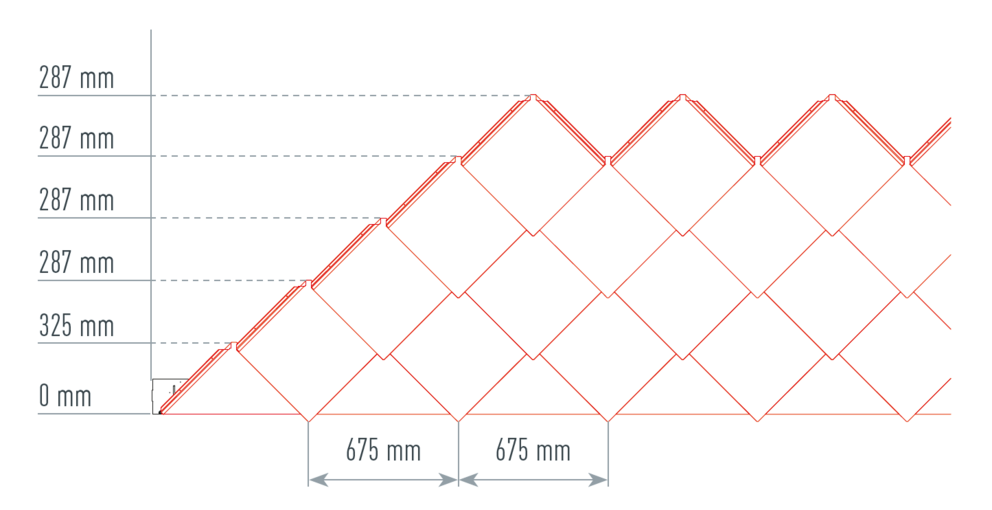 Zur Hilfestellung bei der Verlegung der PREFA Dachrauten 44 × 44 empfiehlt es sich, einen Raster aus senkrechten Schnurschlägen im Abstand von 675 mm herzustellen (als Hilfestellung dienen die Markierungen im Saumstreifen). Um das Schnürmaß in jeder Reihe genau einzuhalten, kann bei Bedarf auch das halbe Schnürmaß angezeichnet und in regelmäßigen Abständen geprüft werden. Richten Sie die Startplatten mit den Markierungen (an der Oberkante der Startplatten) an den senkrechten Schnurschlägen aus (siehe Abbildung unten). Hierbei ist zu beachten, dass der Bereich für die seitliche Aufkantung (z. B. Ortgangausbildung) nicht mittig in den Dachrauten 44 × 44 liegt (Symmetrie/Dachmitte beachten).