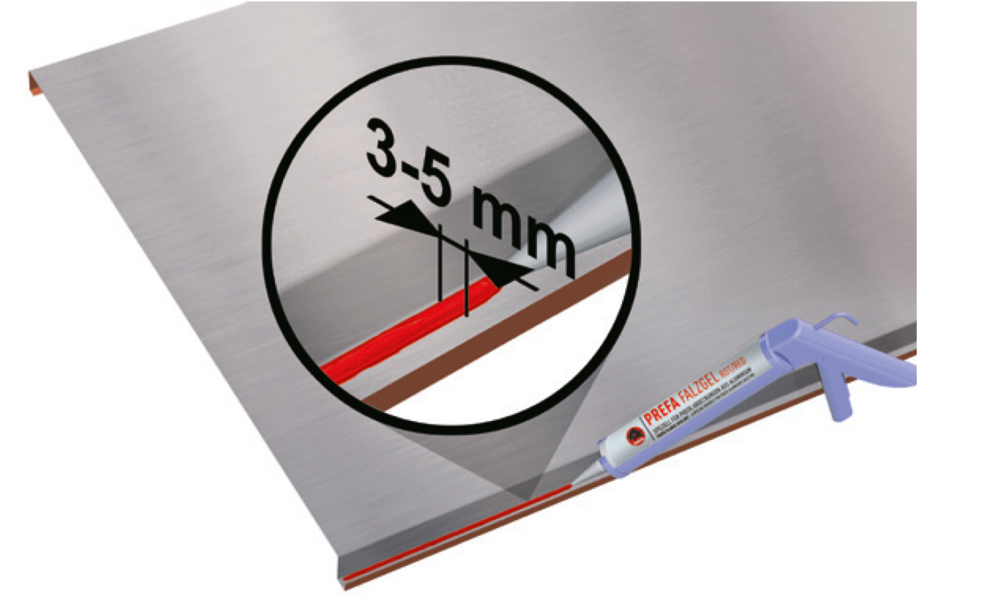 Je geringer das Dachgefälle, desto höher ist das Risiko, dass Wasser – etwa durch Treibregen, Schnee oder Stauwasser – durch den Falz unter die Metalleindeckung eindringt. Bei einer Dachneigung von bis zu 7° sind daher besondere Maßnahmen zur Abdichtung erforderlich, z. B. der Einsatz von PREFA Falzgel.