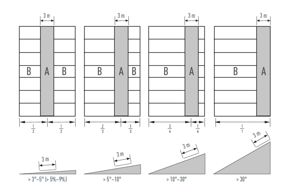 Die Länge des Festhaftbereiches soll 3 Meter betragen. Die Lage des Festhaftbereiches ist grundsätzlich in Abhängigkeit der Dachneigung zu wählen – siehe Abbildung unten sowie die zugehörige Tabelle. Durchdringungen oder die Dachform können die Lage des Festhaftbereiches beeinflussen. Bereiche mit unterschiedlicher Lage des Festhaftbereiches sind durch Trennleisten zu trennen.
