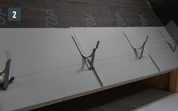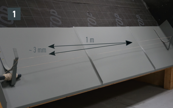 • Höchst- und tiefstliegenden Saumrinnenhaken im Sparren befestigen. Saumrinnenhaken üblicherweise im Sparrenabstand befestigen (Gefälle ca. 3 mm pro Meter) (Bild 1).