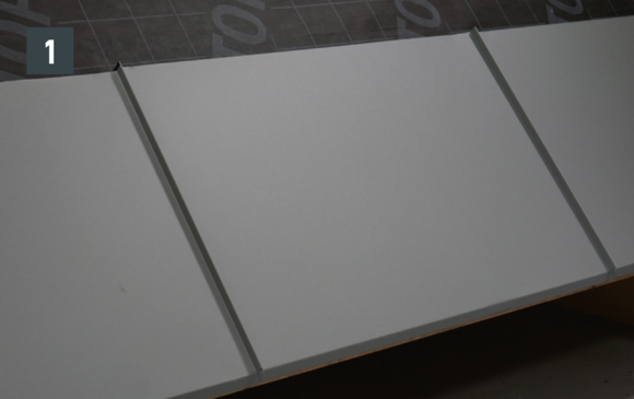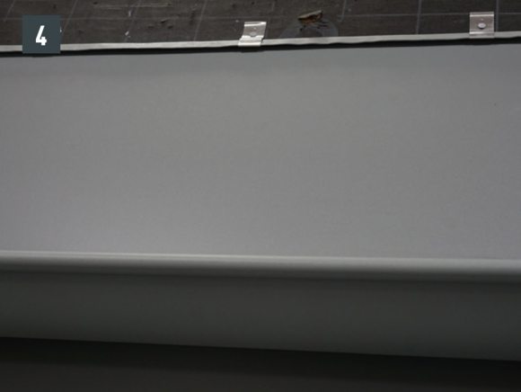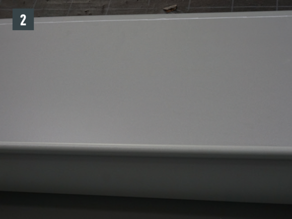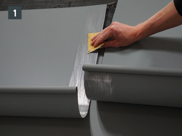 • Überlappungsbereich an der Saumrinnenoberseite sowie an der Unterseite des Saumrinnenendbodens anschleifen und mit PREFA Haftreiniger reinigen. Verdunstungszeit von 5 Minuten abwarten (Bild 2).