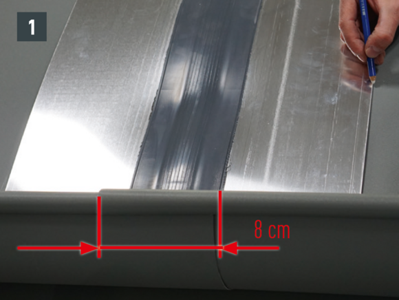 • Überlappungsbereich (ca. 8 cm) an der Unter- bzw. Oberseite der Saumrinne markieren und anschleifen (Bild 1).