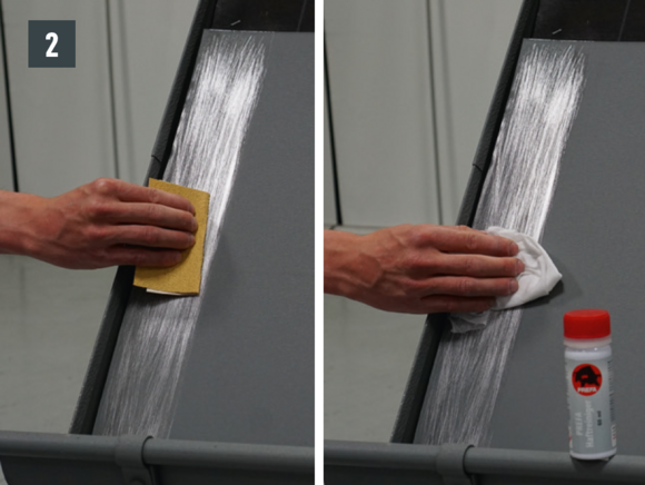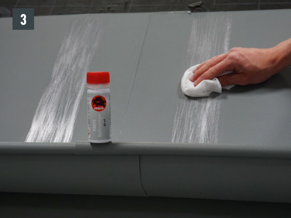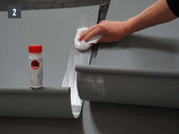 • Die angeschliffenen Klebeflächen mit PREFA Haftreiniger reinigen. Verdunstungszeit von 5 Minuten abwarten (Bild 2).