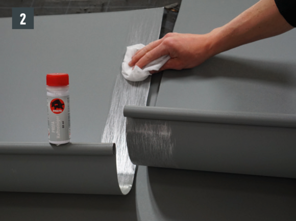 Die Verbindung kann als Klebe- oder Nietverbindung hergestellt werden. Genietete Verbindungen sind zusätzlich mit PREFA Spezialsilikon abzudichten.
