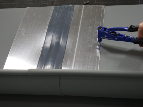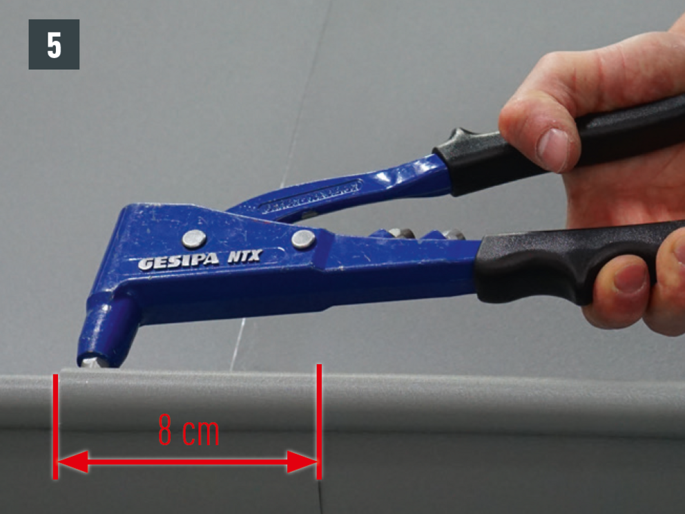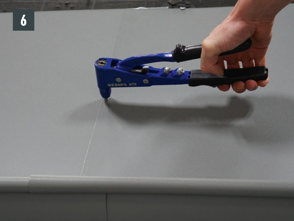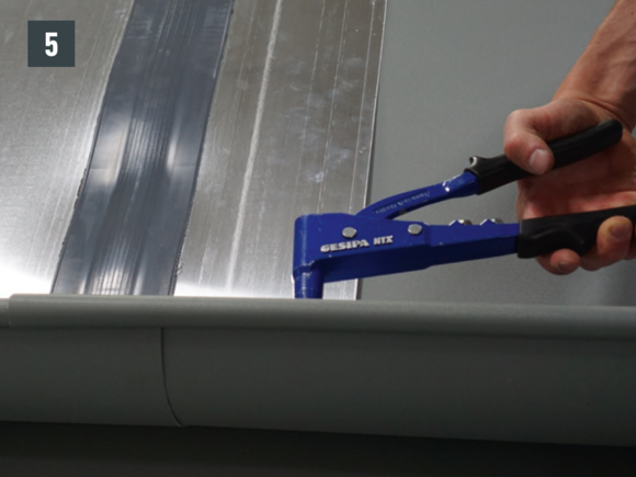 • Niete zur Fixierung am Rinnenwulst setzen. Saumrinne mittig mit zusätzlicher Niete fixieren (Bild 6).