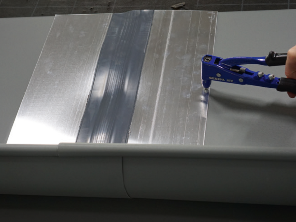 Die Saumrinnenverbindung kann auch als Nietverbindung mit 20 Stk. PREFA Patentnieten 4 x 9,5 mm im Kreuzstich und Abdichtung mittels PREFA Spezialsilikon hergestellt werden.