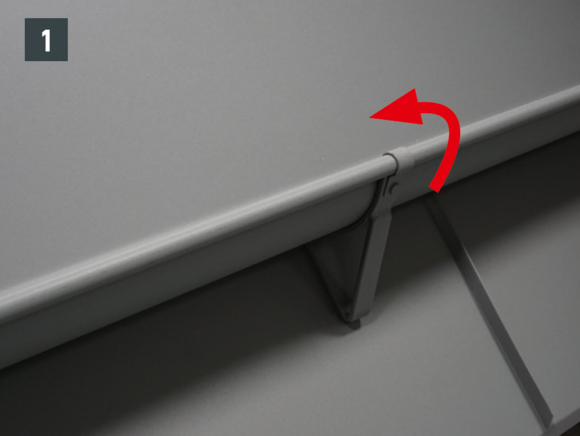 • Saumrinne einlegen und Federn der Saumrinnenhaken schließen. Am tiefsten Punkt beginnend. Die Überlappung der Dachrinnenverbindung muss in Richtung des Gefälles erfolgen (Bild 1).