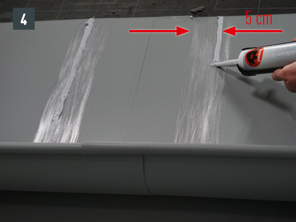 • Mit PREFA Spezialkleber eine Kleberaupe mit ca. 8 mm Dicke aufbringen (Bild 4).