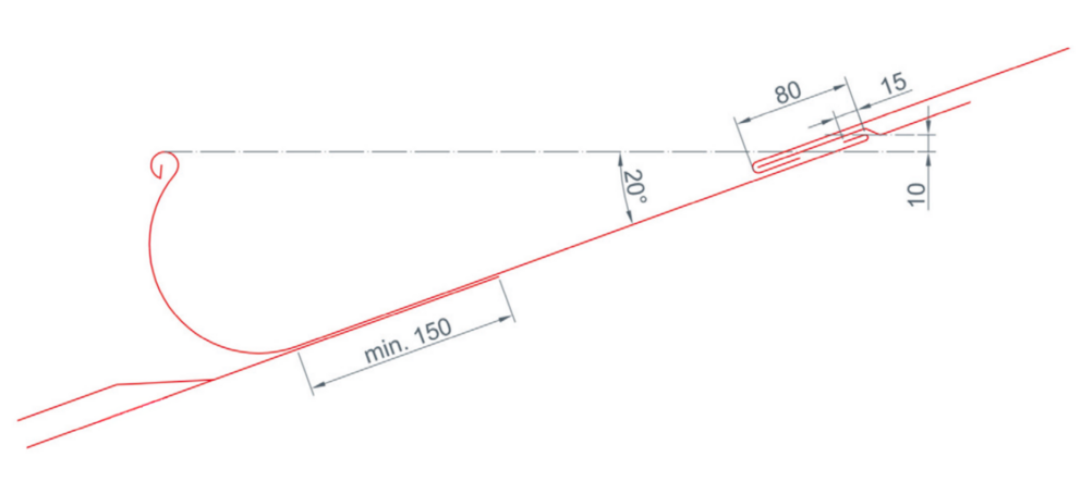 Es ist darauf zu achten, dass die dachseitige Rückkantung um 10 mm höher liegt als die Saumrinnenvorderseite. Daraus ergibt sich bei der PREFA Saumrinne eine Mindestdachneigung von 20° (siehe Abbildung unten).