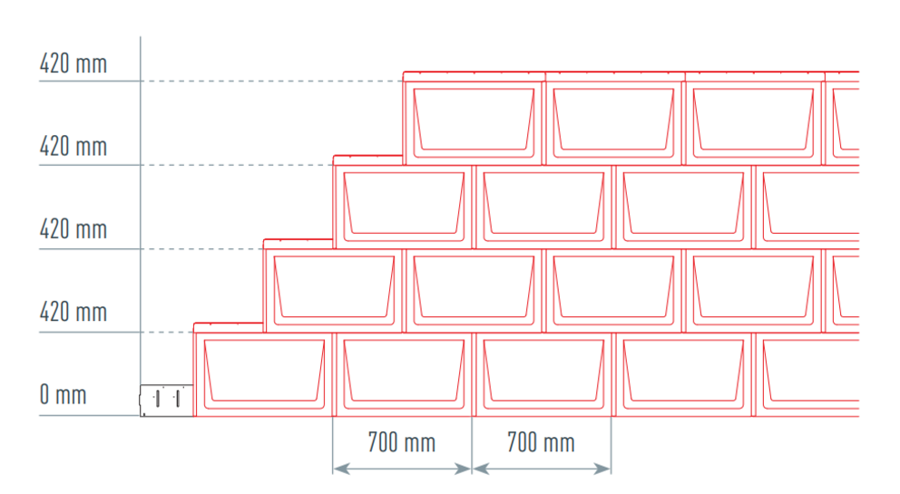 Vertikale Schnürung: 700 mm (jede zweite Reihe um 350 mm versetzt)