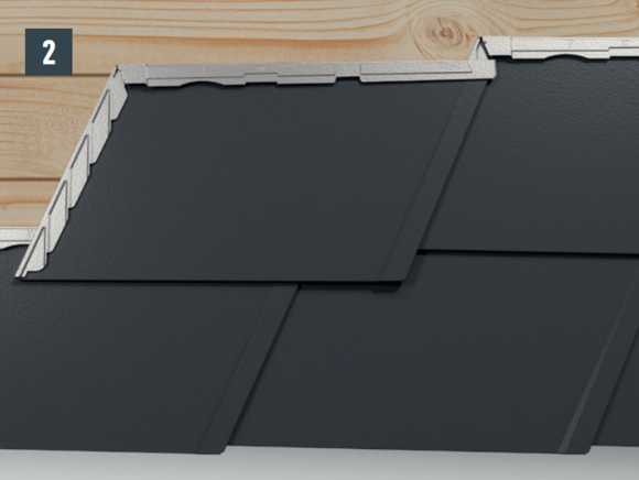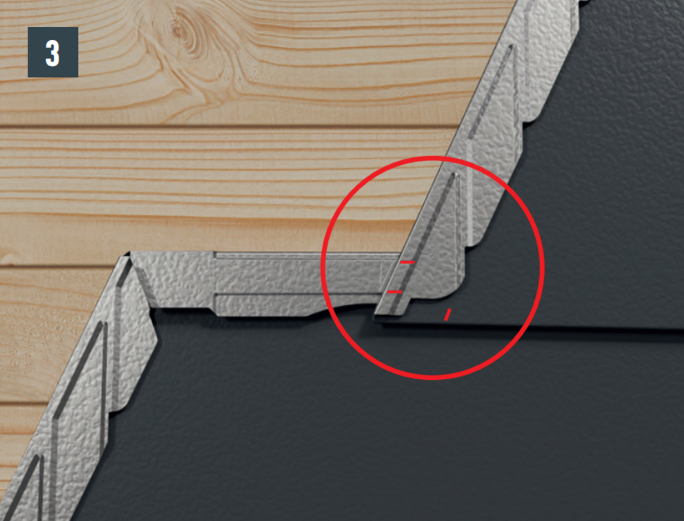 • Die beiden Einkerbungen am schrägen Falz der Dachschindel DS.19 markieren das untere bzw. obere Ende der Sicke am oberen Schindelumschlag der darunterliegenden Dachschindel DS.19 (Bild 3).