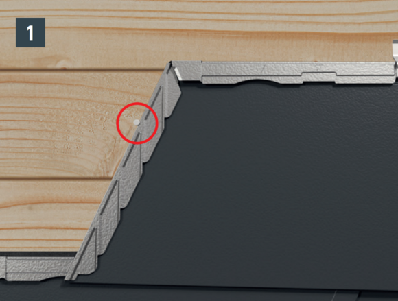• Die jeweils erste Dachschindel DS.19 kann in jeder Reihe links neben dem schrägen Falz mit einem Nagel fixiert werden, um ein seitliches Verschieben zu verhindern (Bild 1).