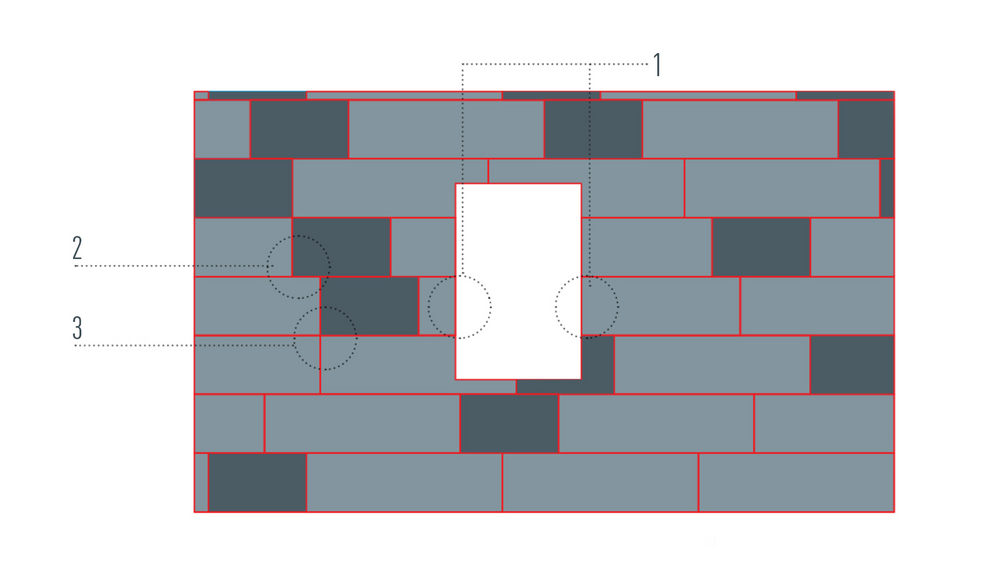 Ein abgeschnittenes FX.12-Paneel wurde an der anderen Seite der Öffnung weiterverwendet (1). Somit ist eine korrekte Stoßverteilung nicht mehr gewährleistet (2) und kann im schlimmsten Fall zu einer Überlappung der Stöße führen (3). Deshalb wurden Verlegebeispiele für einen optimalen Stoßversatz erstellt.