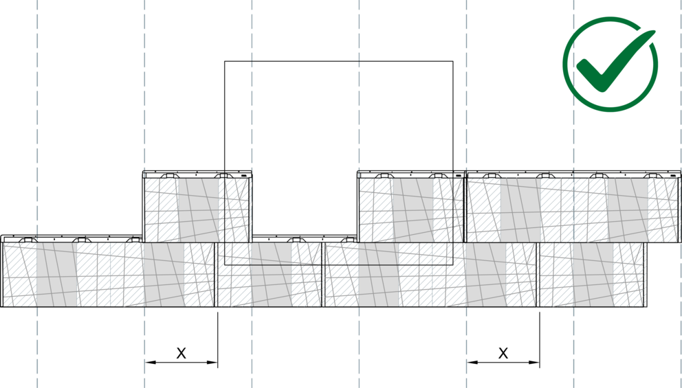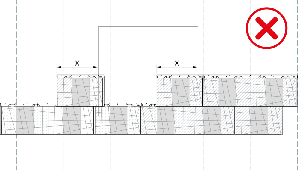 Bei der Verlegung der Fassadenpaneele FX.12 darf kein Winkelfalz direkt über einem anderen liegen, es ist ein seitlicher Versatz von mind. 220 mm einzuhalten. Beim Kombinieren von großen und kleinen FX.12-Paneelen muss bei jeder neuen Reihe der Stoß des ersten Paneels im Bereich „X“ gestartet werden.