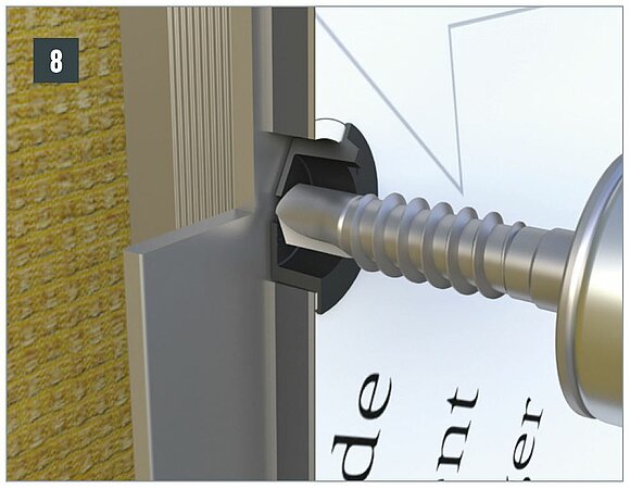 Ziehen Sie die Schraube mit moderatem Drehmoment an, sodass die Schraube zwar die Platte ausreichend in Ihrer Position hält, ohne jedoch den Fassadenzentrierdichtring unter dem Schraubenkopf hervorzudrücken.