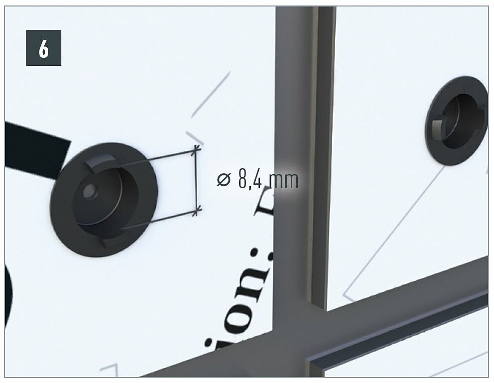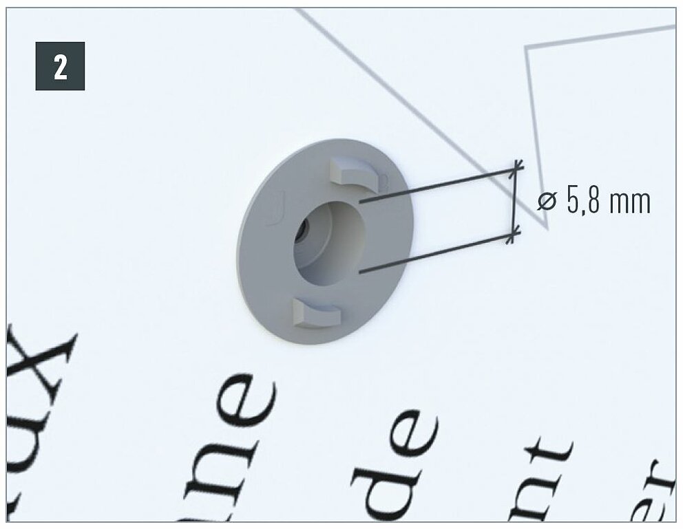 Um ein zentrisches Bohren der Unterkonstruktion zu erzielen, verwenden Sie ausschließlich entweder die passende Bügelbohrvorrichtung oder die Einhand-Federbohrvorrichtung, welche das Zentrum des Bohrlochs einer Verbundplatte auf die Unterkonstruktion übertragen.