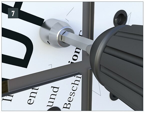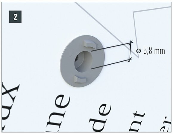 Da die PREFABOND Aluminium Verbundplatte an diesem Punkt fest mit der Holzunterkonstruktion verbunden ist, wird mit einem Festpunkt das Verschieben der Platte verhindert. Um einen Festpunkt zu erhalten, drücken Sie in das Bohrloch die Festpunkthülse ⌀ 8,5 mm auf ⌀ 5,1 mm. Im Weiteren Schritt kann die Schraube eingedreht werden.