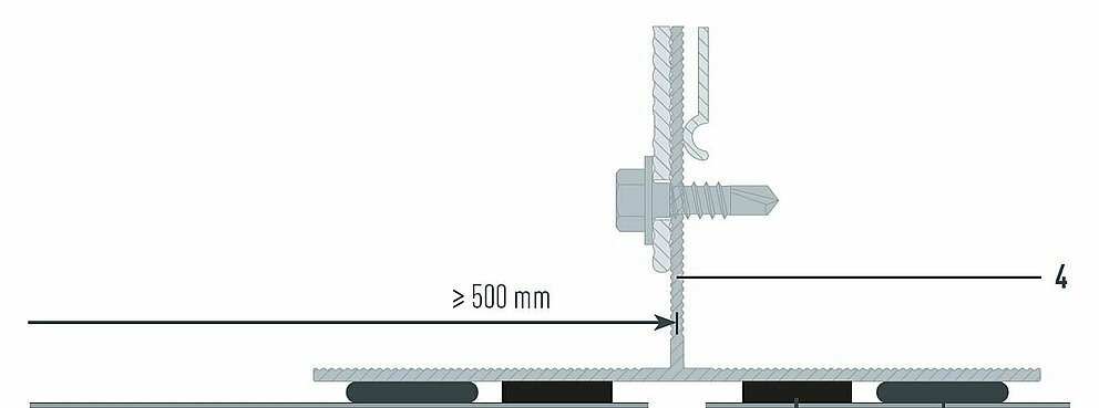Um die Materialausdehnung zu berücksichtigen, dürfen keine Unterkonstruktionstragprofile verwendet werden, deren Länge 3.000 mm überschreitet. Achten Sie darauf, dass die Unterkonstruktionsprofile nicht in einer Platte gestoßen werden, da hier eine fixe Verbindung geschaffen wird.