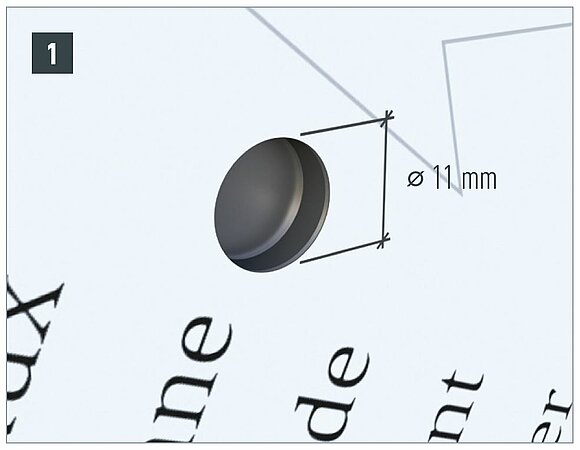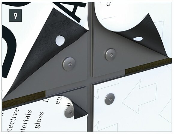 Ritzen Sie mit dem PREFA Folienschneider ⌀ 9,5 mm die Schutzfolie rund um das Bohrloch leicht an, sodass die Schutzfolie nach Vollendung der Montage ohne Mühe abgezogen werden kann. Ansonsten kann es passieren, dass die Folie zwischen der Platte und der Unterseite des Schraubenkopfes geklemmt wird, was das Abziehen erschwert.