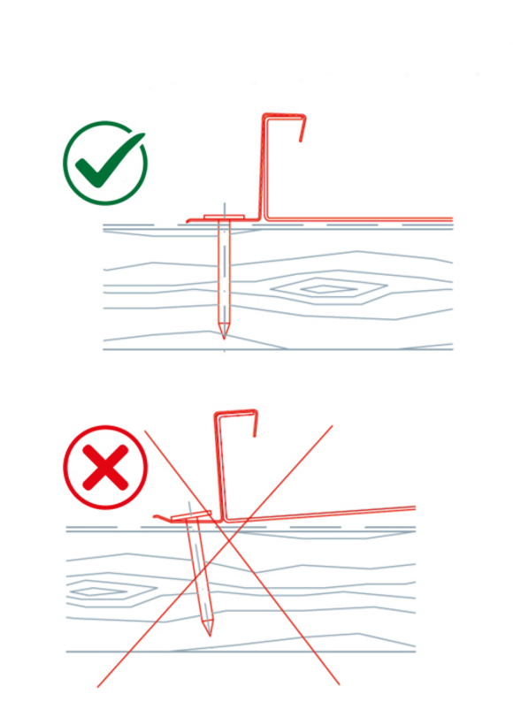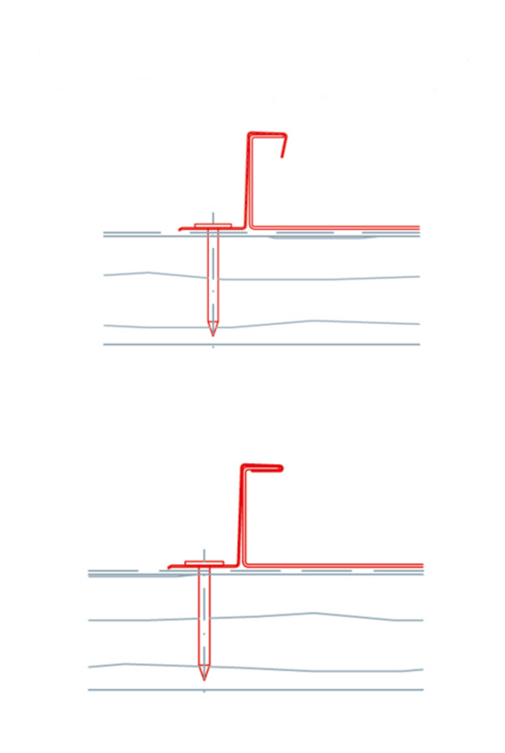 Bei der Befestigung der PREFA Niro Winkelstehfalz- und Winkelschiebehaft ist darauf zu achten, dass die Rillennägel zur Befestigung ausreichend versenkt sind und nicht über die Höhe der Rillensicke ragen, um Druck- und Scheuerstellen in der verlegten Eindeckung zu vermeiden. Für die Befestigung von PREFA Winkelstehfalzhaften sind je Haft 2 Stk. PREFA Niro-Rillennägel zu verwenden. Für die Befestigung von PREFA Winkelschiebehaften sind je Haft 3 Stk. PREFA Niro-Rillennägel zu verwenden.