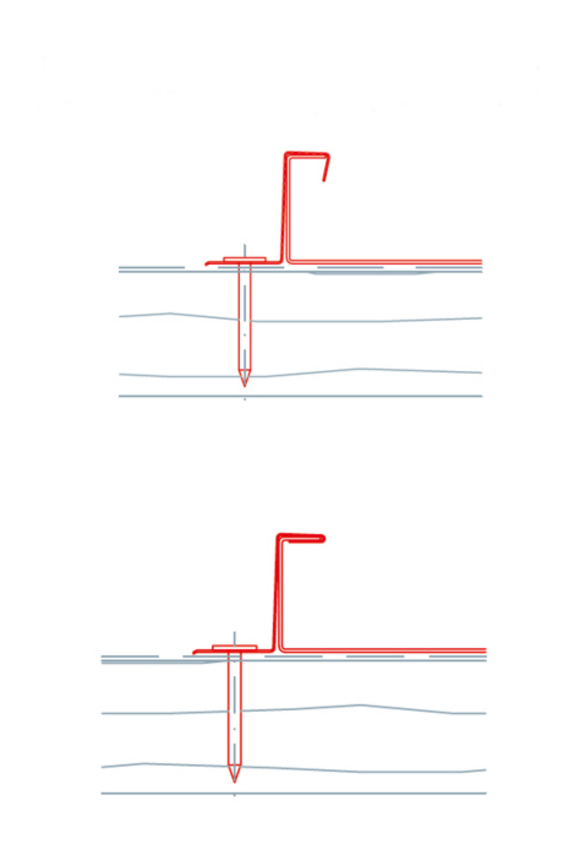 Bevor die Scharen auf der Unterdeckerseite mit Niro-Haften auf der Schalung befestigt werden, ist zunächst der Falz auf der eingehängten Oberdeckerseite vollständig zu schließen.