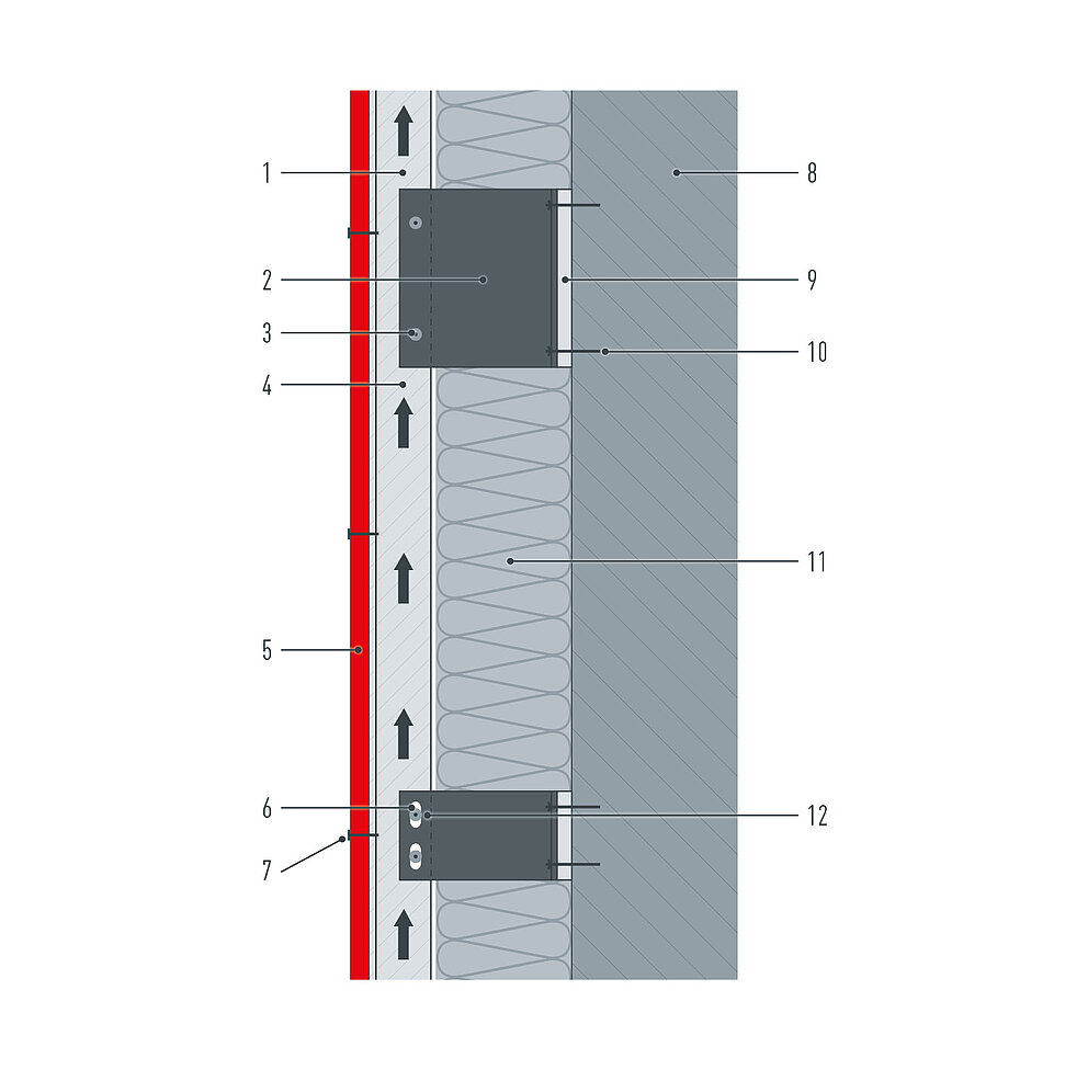 Der Hinterlüftungsspalt muss je nach Materialwahl der Unterkonstruktion den national geltenden Anforderungen entsprechen. Um in der Hinterlüftungsebene einen ungehinderten Strömungsverlauf zu gewährleisten, müssen die Tragprofile passend zur Profilverlegung ausgerichtet werden. Der Aufbau der Unterkonstruktion kann je nach Verlegerichtung der Profile 1-lagig oder mehrlagig ausgeführt werden.