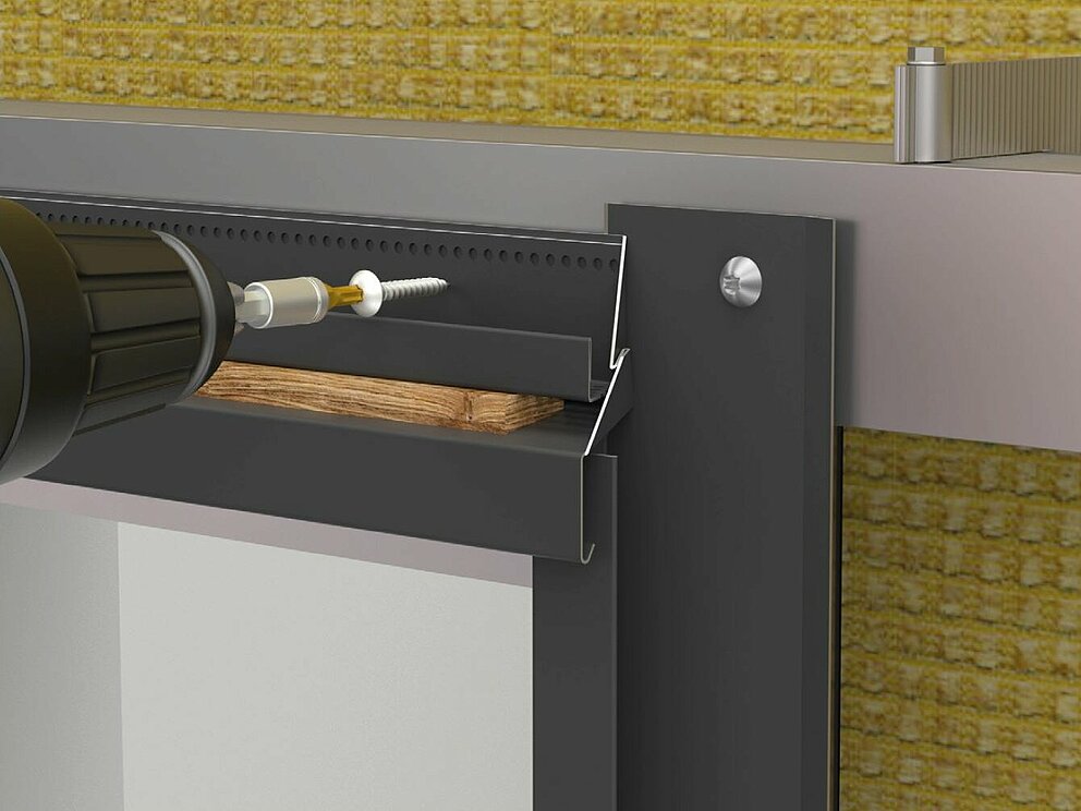 Anschließend werden links und rechts des Fensters die Haltewinkel für das Laibungsblech an die Unterkonstruktion geschraubt. Zugleich werden auch die Steckleisten für das Laibungsblech und die Steckleiste für den Fenstersturz am Fensterrahmen oder Mauerwerk befestigt.