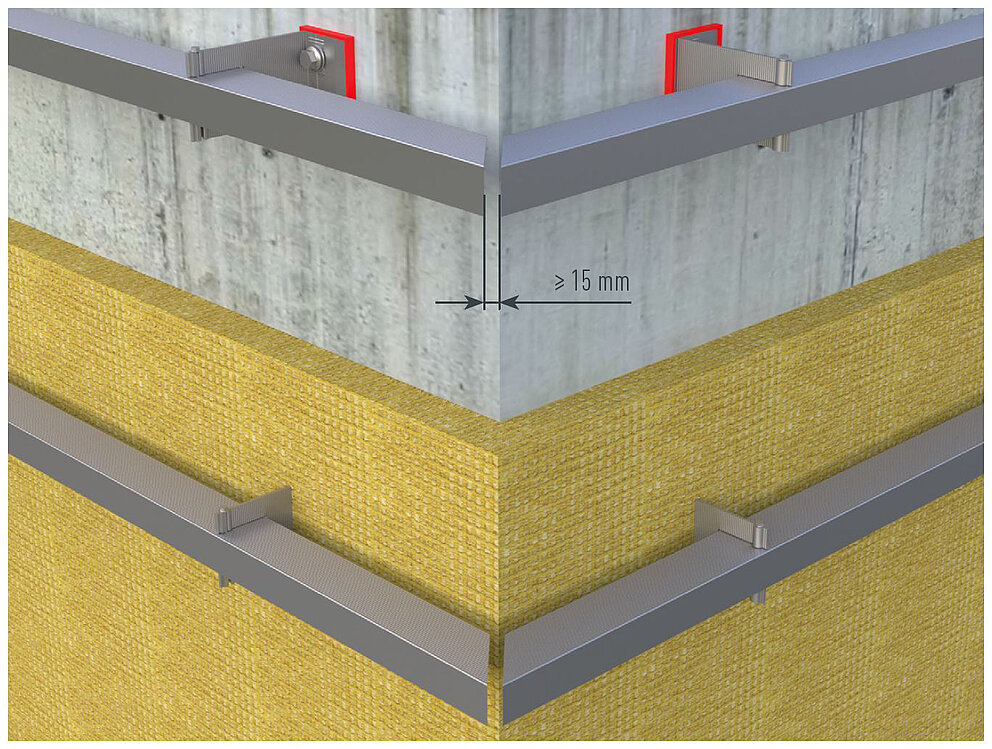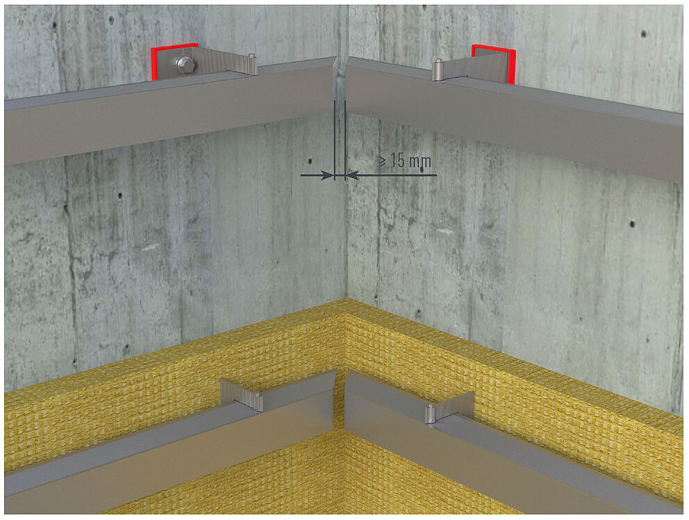 Achten Sie bei der Montage von Innen- oder Außeneckprofilen darauf, dass die Unterkonstruktionstragprofile im Eckbereich nicht stoßen. Halten Sie eine Distanz von mind. 15 mm. Bei der Befestigung muss eine dehnungsgerechte Montage mit einer klaren Definition von Fest- und Gleitpunkten berücksichtigt werden.