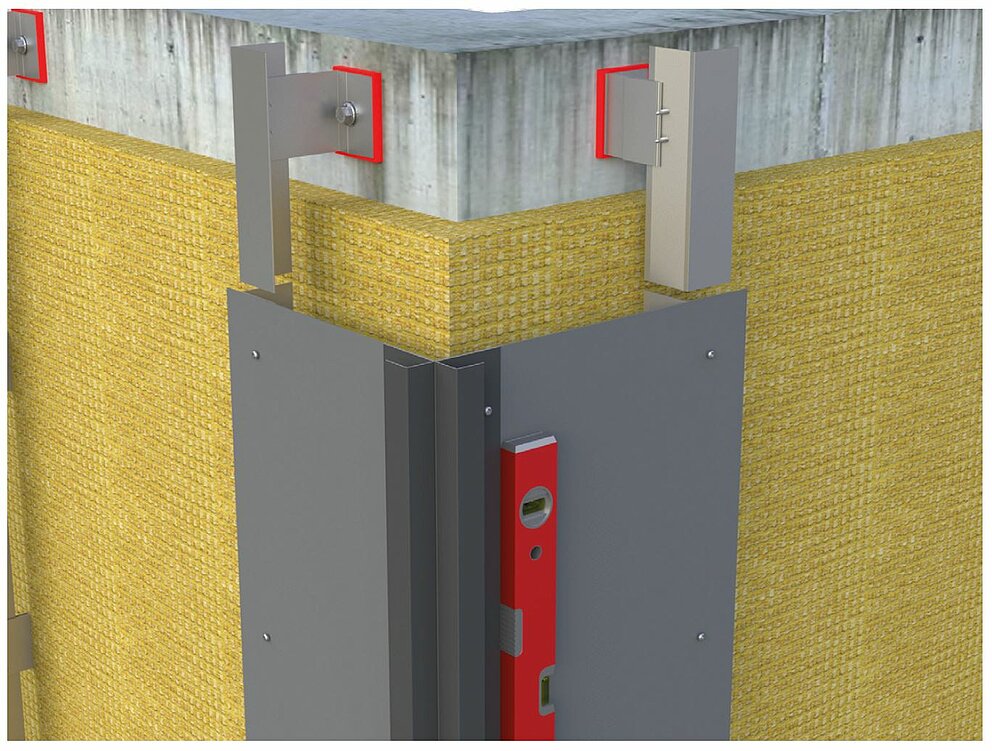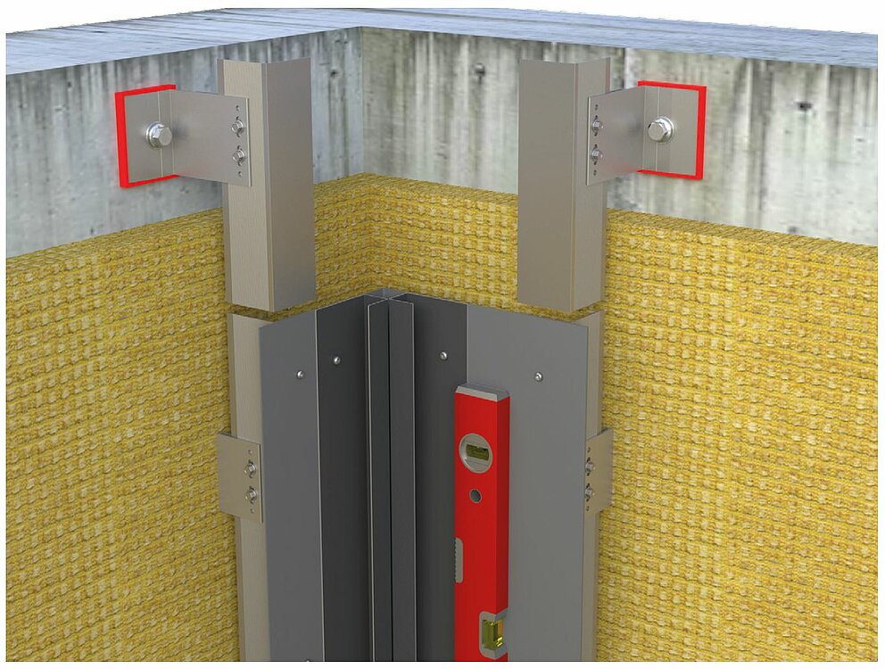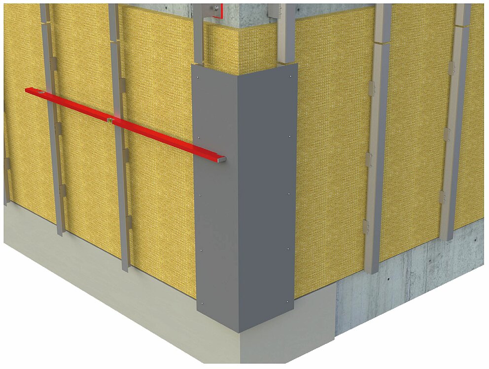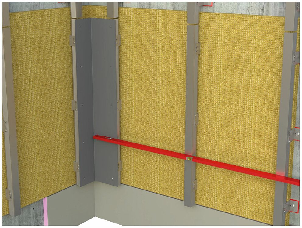 Bereiten Sie für die Montage der Innen- oder Außenecke die Unterkonstruktion für eine horizontale Profilverlegung vor. Für die Montage der Innen- oder Außeneckprofile müssen Sie zunächst die vertikale Unterkonstruktion mit einem Tragwinkel aus 2 mm dickem Aluminium-Tafelblech oder verzinktem Stahlblech (1 mm) verbinden. Beachten Sie bereits bei der Montage der Unterkonstruktion, die Tragprofile um die Materialdicke des Tragwinkels weiter nach innen zu positionieren, um die Planheit der Unterkonstruktion sicherzustellen.