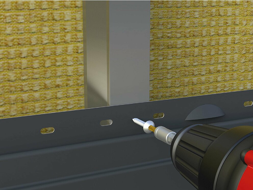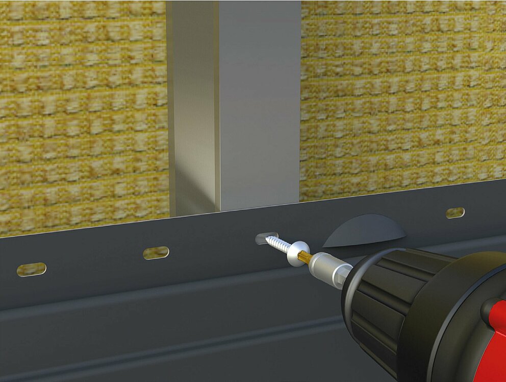 Die Befestigungsschraube wird zentrisch durch das vorgestanzte Langloch auf der Befestigungslasche in das Tragprofil geschraubt. Sollte direkt über einem UK-Tragprofil kein vorgestanztes Langloch liegen, muss z. B. mit Hilfe einer Langlochzange ein Langloch hergestellt werden, um die zwängungsfreie Ausdehnung des Sidings zu ermöglichen.
