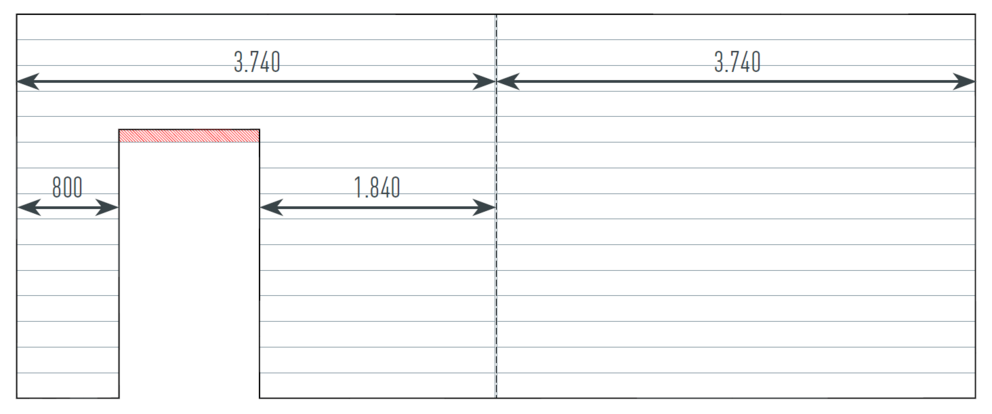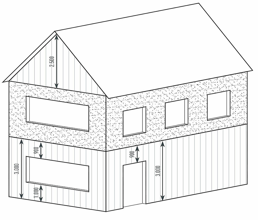 Ausschnitte, wie z. B. Fenster oder Türen, die teilweise in ein Siding hineinragen, sind bei der Materialermittlung zu vernachlässigen und bauseits anzupassen (rot markierte Fläche).