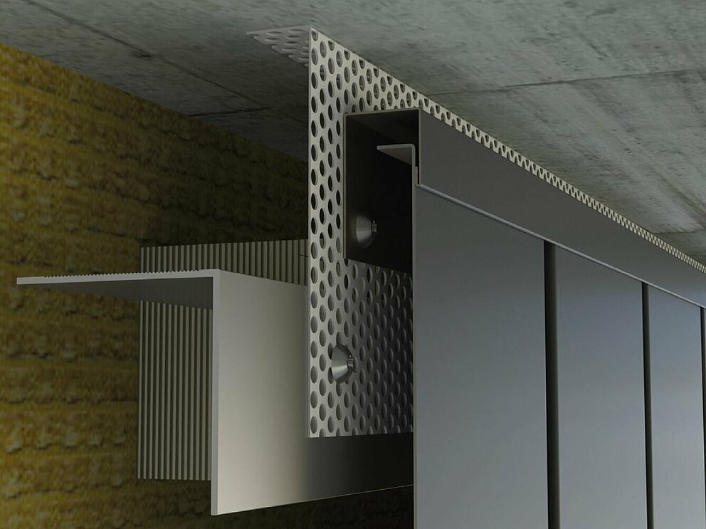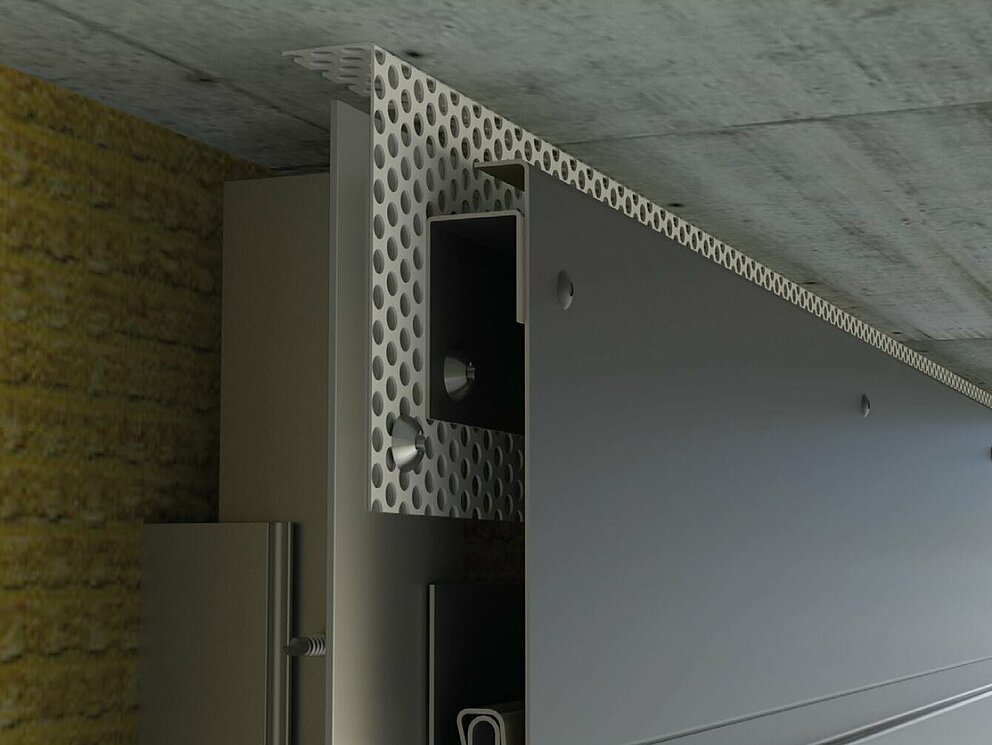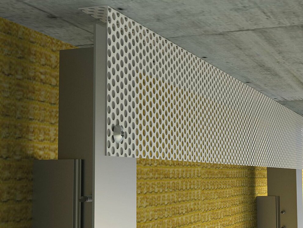 Um die Fassade ordnungsgemäß zu hinterlüften, muss am oberen Abschluss eine Abluftöffnung vorgesehen werden. Montieren Sie bei der Abluftöffnung (z. B. Dachuntersicht) ein Lochblech mit 90° Umbug, um eine höhere Steifigkeit zu erhalten.