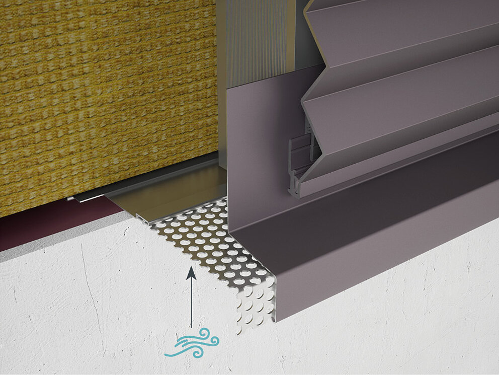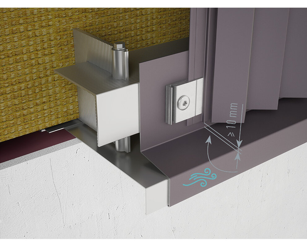 Um bei den Strangpressprofilen eine ausreichende Zuluft der Hinterlüftung zu gewährleisten, muss der Abstand zwischen Unterkante Profil und Wetterschenkel mind. 10 mm betragen.