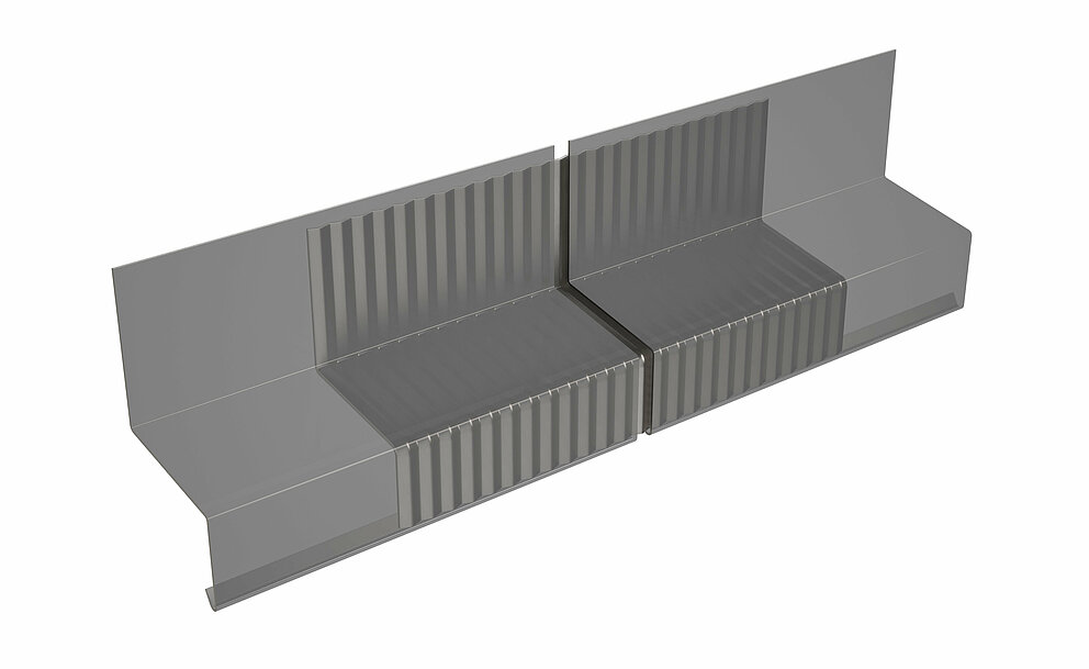 Beginnen Sie nach der fertig errichteten Unterkonstruktion mit der Montage von Steckleiste, Abdeckstreifen, Lochblech und Wetterschenkel. Die Stoßausbildung des Wetterschenkels erfolgt überlappend und geklebt. Der (verdeckt) darunterliegende Wetterschenkel wird eingeschnitten, sodass der darüberliegende Wetterschenkel montiert werden kann.