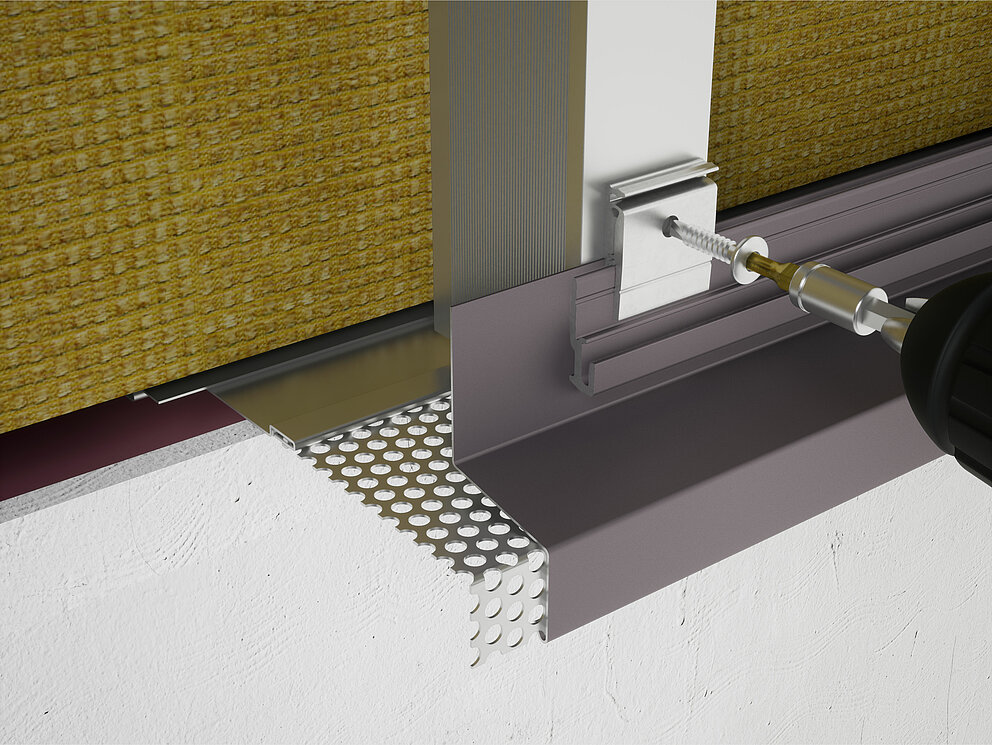 Wenn die Anschlussvorbereitungen für den Sockelbereich der VHF (Lochblech und Abdeckstreifen) montiert sind, kann die Montage mit dem Startprofil beginnen. Das Startprofil ist immer das erste Profil für die Errichtung einer Strangpressprofil-Fassade.