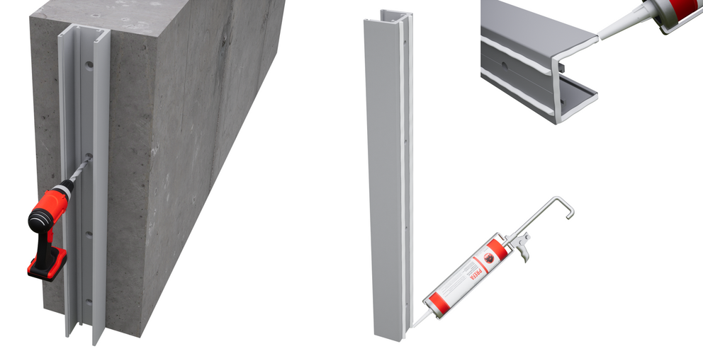 • Zwei Raupen aus wasserdichter und dauerelastischer Dichtmasse auf der Rückseite des U-Profils anbringen.