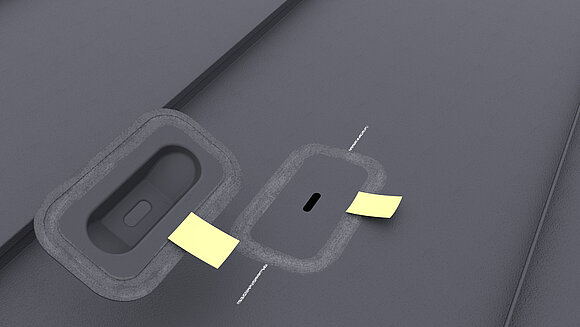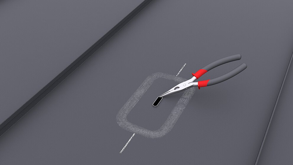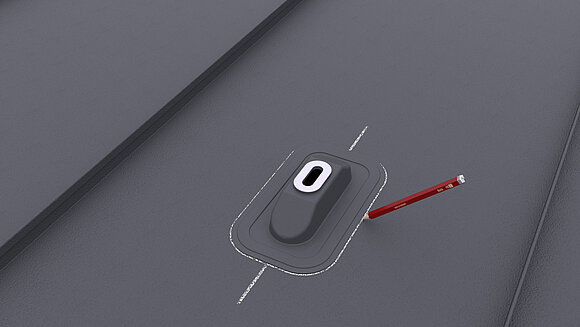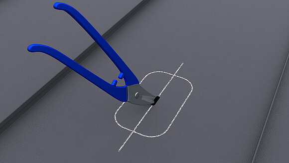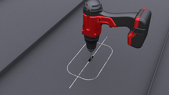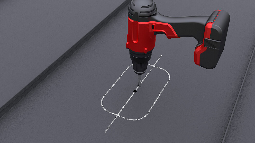 Umriss und Langloch markieren. Langloch (⌀ 13 mm) in der PREFALZ Bahn vorbohren (Bohrung ausreichend bei Kleinformat). Langloch in der PREFALZ Bahn ausschneiden (entfällt bei Kleinformat).