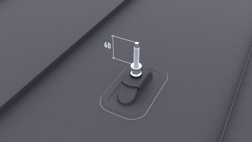 Mutter festdrehen, bis sich die EPDM-Dichtung nach außen wölbt (Gabelschlüssel: SW 18). Die zweite Mutter montieren und ganz nach unten drehen. Stockschraube von der Oberkante der zweiten Mutter (Auflage Schienenhalter) 60 mm nach oben abmessen und abschneiden. Schienenhalter aufsetzen und in entsprechender Höhe (entsprechend den restlichen Solarhaltern) mit zwei Gabelschlüsseln festziehen (Gabelschlüssel: SW 18).