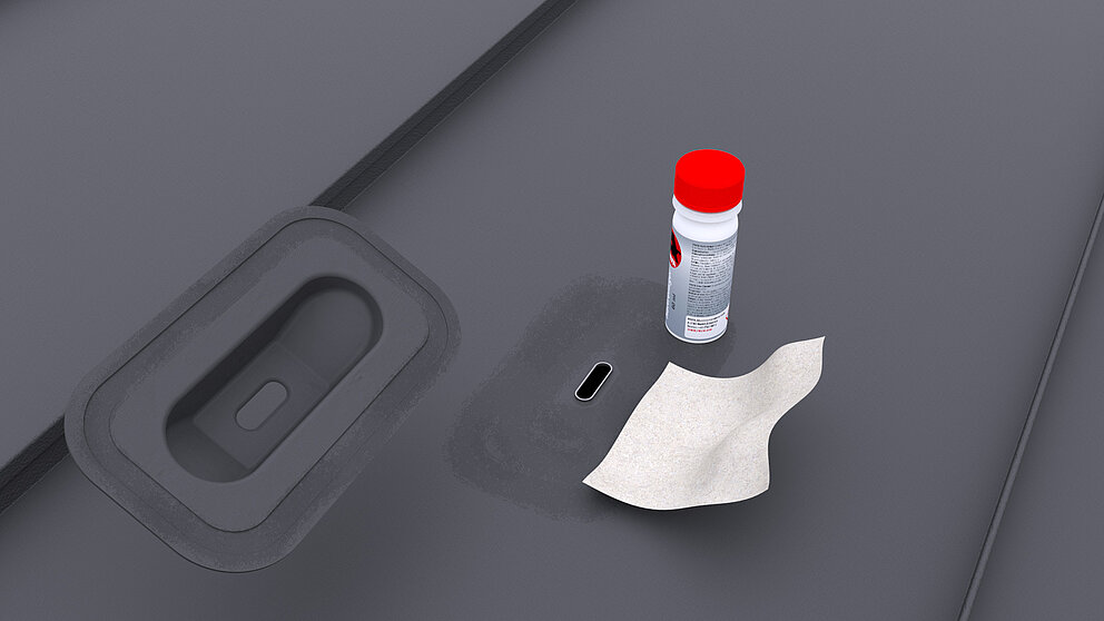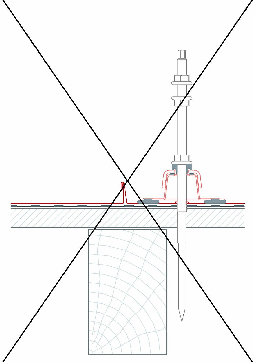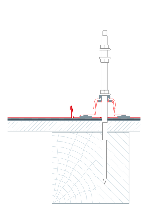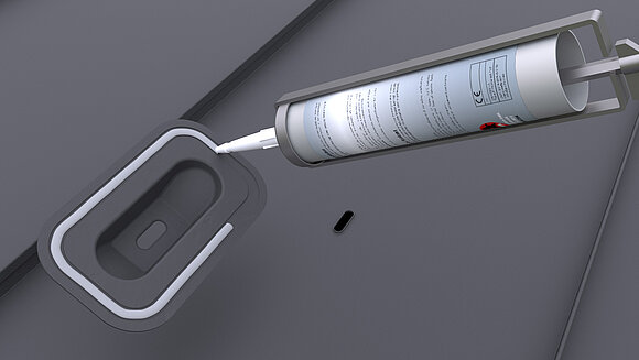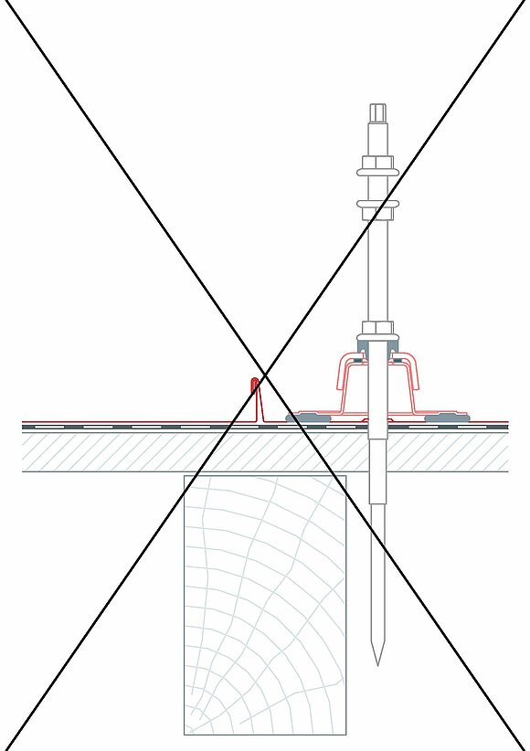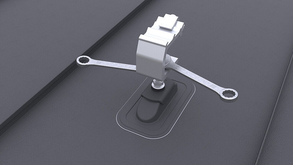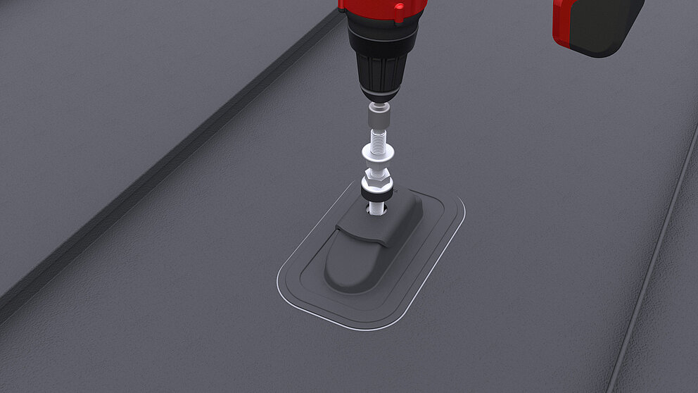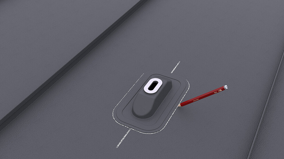 Klebestelle an der Dacheindeckung und am PREVARIO Sunny anschleifen. Langloch oder Bohrung aufbördeln. Angeschliffene Klebestellen mit Haftreiniger reinigen. Kleberraupe (⌀ 10 mm) auf den angeschliffenen und gereinigten Sunny auftragen. Den PREVARIO Sunny mittig anpressen. Kalotte aufsetzen und Stockschraube mit Bohrmaschine einschrauben (Steckschlüsseleinsatz SW 9 mm). Eindringtiefe in die tragende Unterkonstruktion (Sparren): mind. 80 mm.
