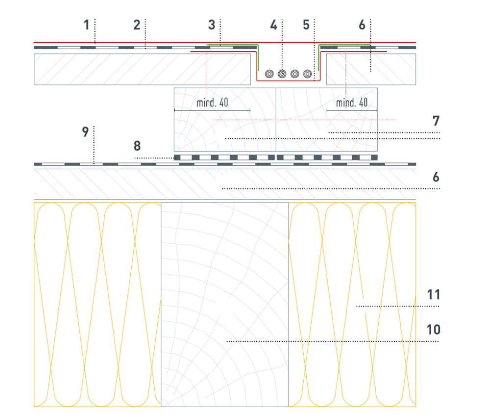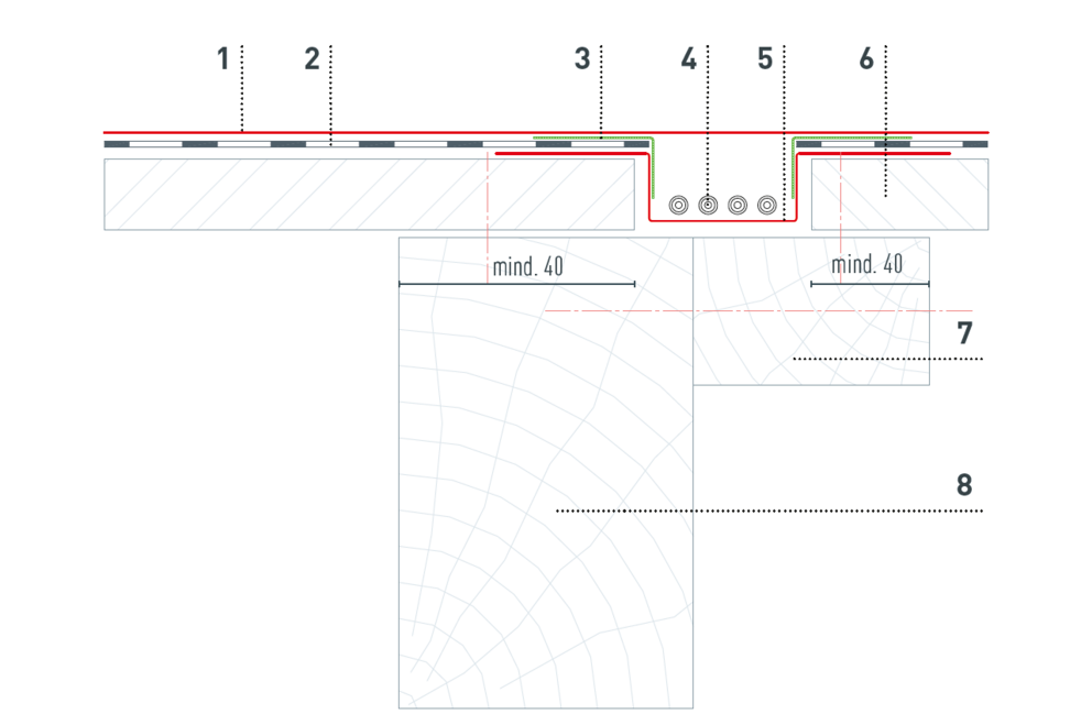 Aufgrund der nötigen Kabelführung ist die Holzunterkonstruktion entsprechend der folgenden Details herzustellen. Die Anzahl und Position der Kabelkanäle werden von der PREFA Produkttechnik definiert und im PV-Verlegeplan dargestellt.
