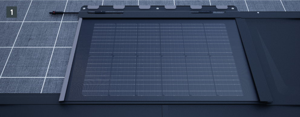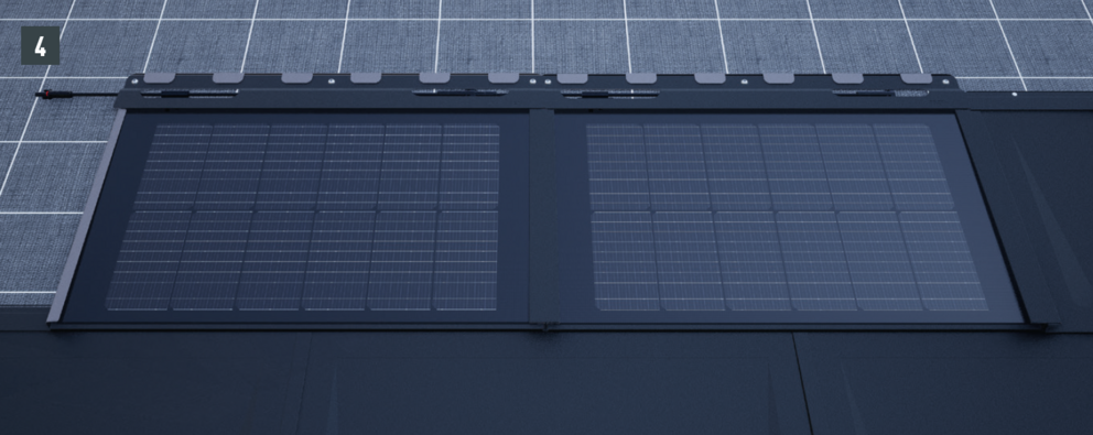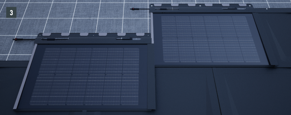 • Positionierung der ersten Solardachplatte auf der vormontierten PREFA Dacheindeckung (Bild 1)