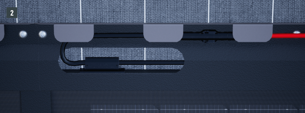• Detailansicht Kontaktierung der Strangableitung (+) bzw. der Verbindungsleitung (Einlegen der Leitung in die dafür vorgesehenen Kabelführungen)